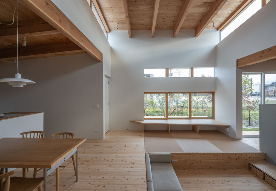 In contrast, the interior is a loosely connected continuous one-room space. This configuration was derived from the client's desire to complete all daily activities—housework, childcare, and family gatherings—within the living room, while maintaining an intimate distance between family members relaxing on both tatami mats and sofas. By utilizing the varying roof heights to install clerestory windows, natural light reaches every corner of the expansive space.
